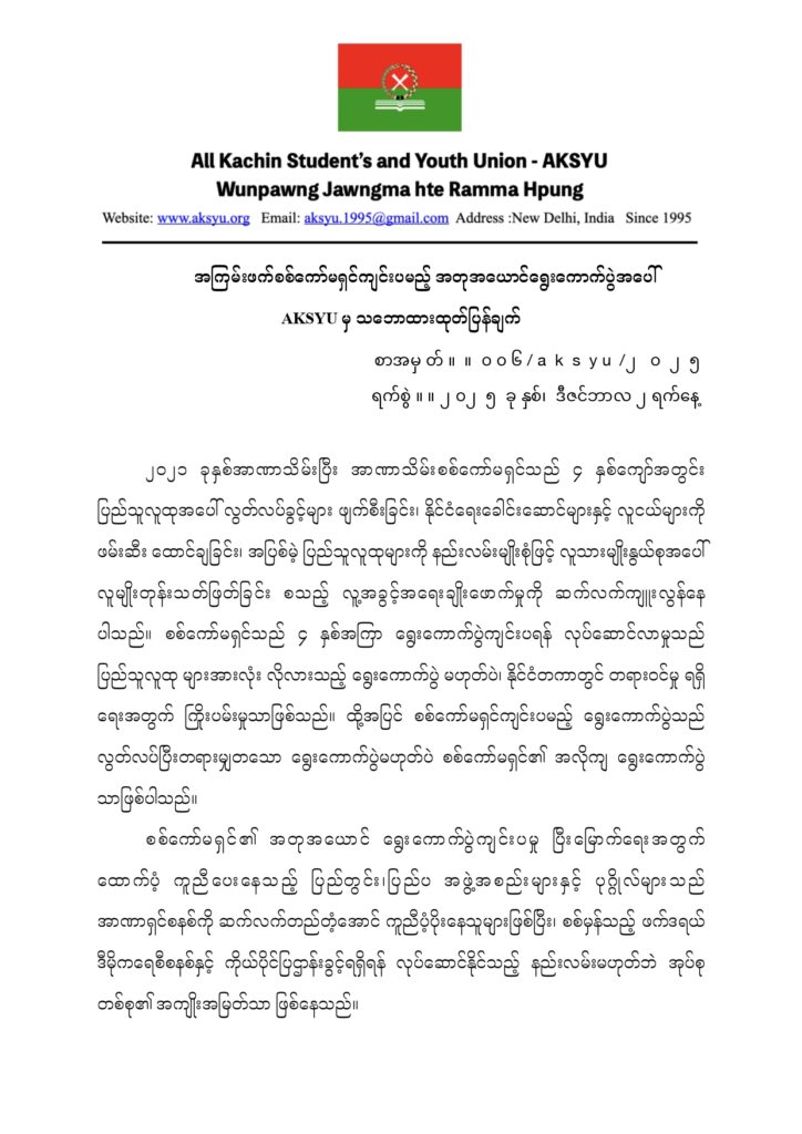 ထို့ကြောင့် အကြမ်းဖက် စစ်ကော်မရှင်မှ ၂၀၂၅ ခုနှစ်၊ ဒီဇင်ဘာလ ၂၈ ရက် မှ စတင်ကျင်းပမည့် အတုအယောင်ရွေးကောက်ပွဲကို နိုင်ငံတကာအဖွဲ့အစည်းများနှင့် ပြည်တွင်းပြည်ပရှိ အဖွဲ့အစည်းများအားလုံး ကန့်ကွက်ကြရန်နှင့် စစ်ကော်မရှင်ပြုလုပ်မည့် အတုအယောင်ရွေးကောက်ပွဲကို မိမိတို့အဖွဲ့အစည်း “ကချင်တမျိုးသားလုံးဆိုင်ရာ ကျောင်းသားနှင့် လူငယ် သမဂ္ဂ” မှ အပြင်းအထန်ရှုံ့ချကြောင်း သဘောထား ထုတ်ပြန်လိုက်ပါသည်။